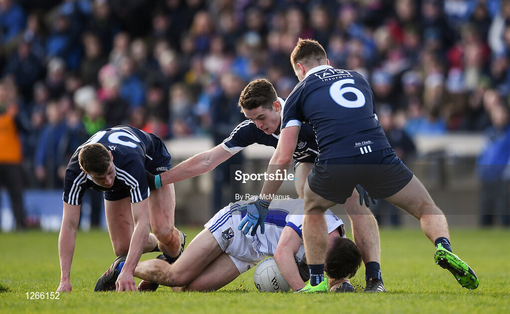 5 February 2017; Dara McVetty of Cavan is tackled by Dublin players John Small, 6, Brian Fenton and Conchúr Mac Aodh, left, during the Allianz Football League Division 1 Round 1 match between Cavan and Dublin at Kingspan Breffni Park in Cavan. Photo by Ray McManus/Sportsfile