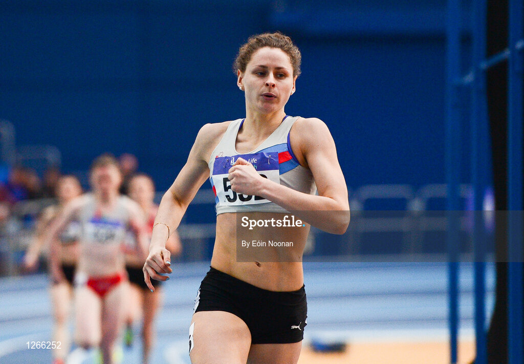 5 February 2017; Sinead Denny of Dundrum South Dublin A.C., Co. dUBLIN competing in the womens 400m during the Irish Life Health AAI Indoor Games at Sport Ireland National Indoor Arena in Abbotstown, Dublin. Photo by Eóin Noonan/Sportsfile