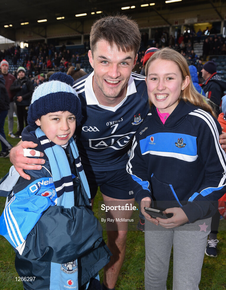 5 February 2017; Dublin's Eric Lowndes poses for a picture with Harry Tindal, 9 years, and his sister Ella, 11 years, from Wicklow Town, after the Allianz Football League Division 1 Round 1 match between Cavan and Dublin at Kingspan Breffni Park in Cavan. Photo by Ray McManus/Sportsfile