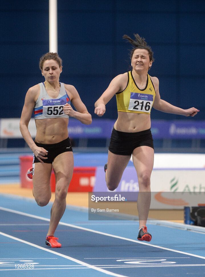 5 February 2017; Sinead Denny of Dundrum South Dublin AC, Co Dublin, left, and Phil Healy of Bandon AC, Co Cork, competing in the womens 400m during the Irish Life Health AAI Indoor Games at Sport Ireland National Indoor Arena in Abbotstown, Dublin. Photo by Sam Barnes/Sportsfile
