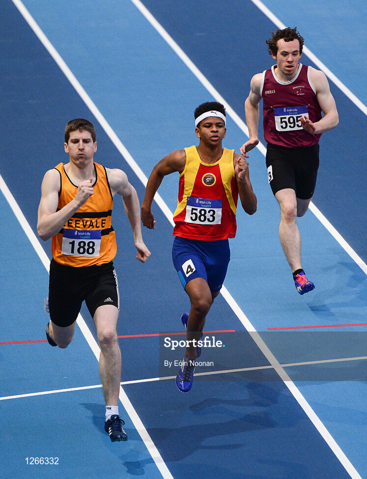 5 February 2017; David Quilligan, left, of Leevale A.C., Co. Cork competing in the mens 200m during the Irish Life Health AAI Indoor Games at Sport Ireland National Indoor Arena in Abbotstown, Dublin. Photo by Eóin Noonan/Sportsfile