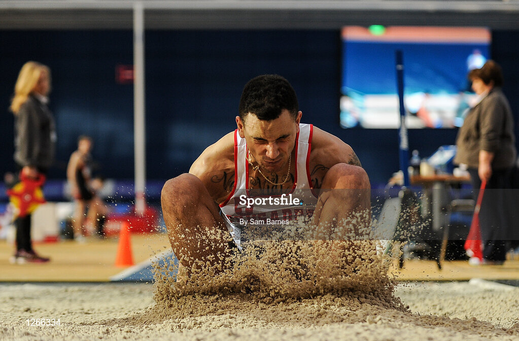 5 February 2017; Adam McMullen of Crusaders AC, Co Dublin, on his way to winning the senior men's long jump during the Irish Life Health AAI Indoor Games at Sport Ireland National Indoor Arena in Abbotstown, Dublin. Photo by Sam Barnes/Sportsfile