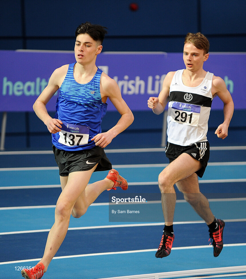 5 February 2017; Darragh McElhinney of Bantry AC, Co Cork, left, and Daragh Fitzgibbon of Donore Harriers AC, Co Dublin competing in the senior men's 3000m during the Irish Life Health AAI Indoor Games at Sport Ireland National Indoor Arena in Abbotstown, Dublin. Photo by Sam Barnes/Sportsfile