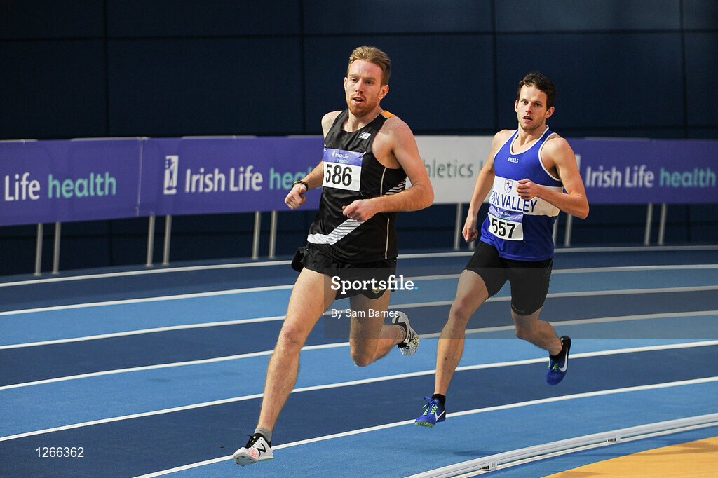 5 February 2017; John Travers of Donore Harriers AC, Co Dublin on his way to winning the senior men's 1500m, ahead of Mark Hoy of Finn Valley AC, Co Donegal, who finished fourth, during the Irish Life Health AAI Indoor Games at Sport Ireland National Indoor Arena in Abbotstown, Dublin. Photo by Sam Barnes/Sportsfile