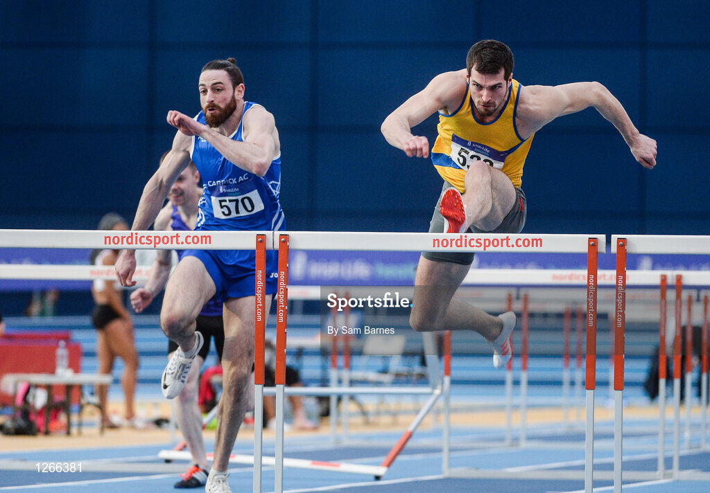 5 February 2017; Ben Reynolds of North Down AC, Co Down, right, and Gerard O'Donnell of Carrick-On-Shannon AC, Co Leitrim competing in the senior men's 60m hurdles during the Irish Life Health AAI Indoor Games at Sport Ireland National Indoor Arena in Abbotstown, Dublin. Photo by Sam Barnes/Sportsfile