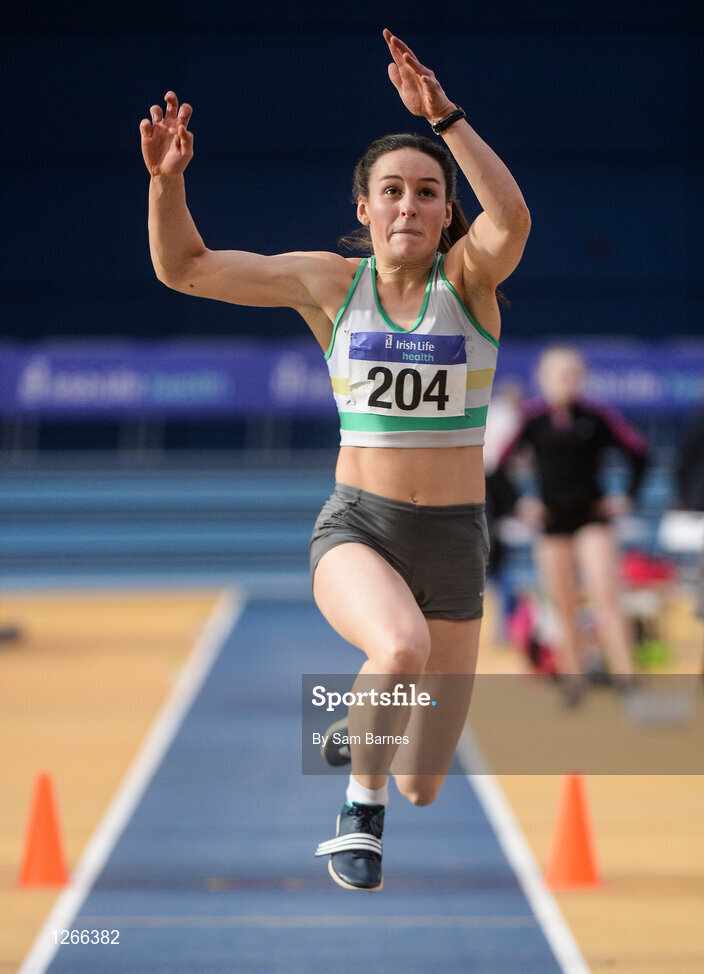 5 February 2017; Saragh Buggy of St Abbans AC, Laois, on her way to winning the senior women's triple jump during the Irish Life Health AAI Indoor Games at Sport Ireland National Indoor Arena in Abbotstown, Dublin. Photo by Sam Barnes/Sportsfile