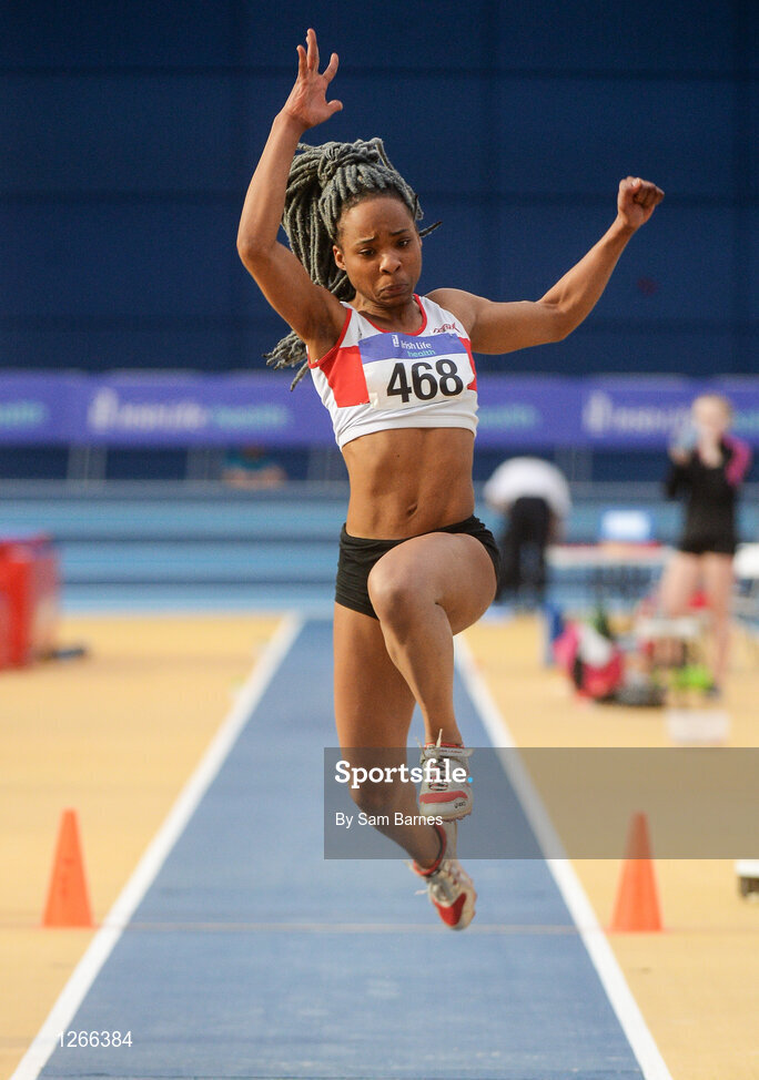 5 February 2017; Solange Diogo of Galway City Harriers competing in the senior women's triple jump during the Irish Life Health AAI Indoor Games at Sport Ireland National Indoor Arena in Abbotstown, Dublin. Photo by Sam Barnes/Sportsfile