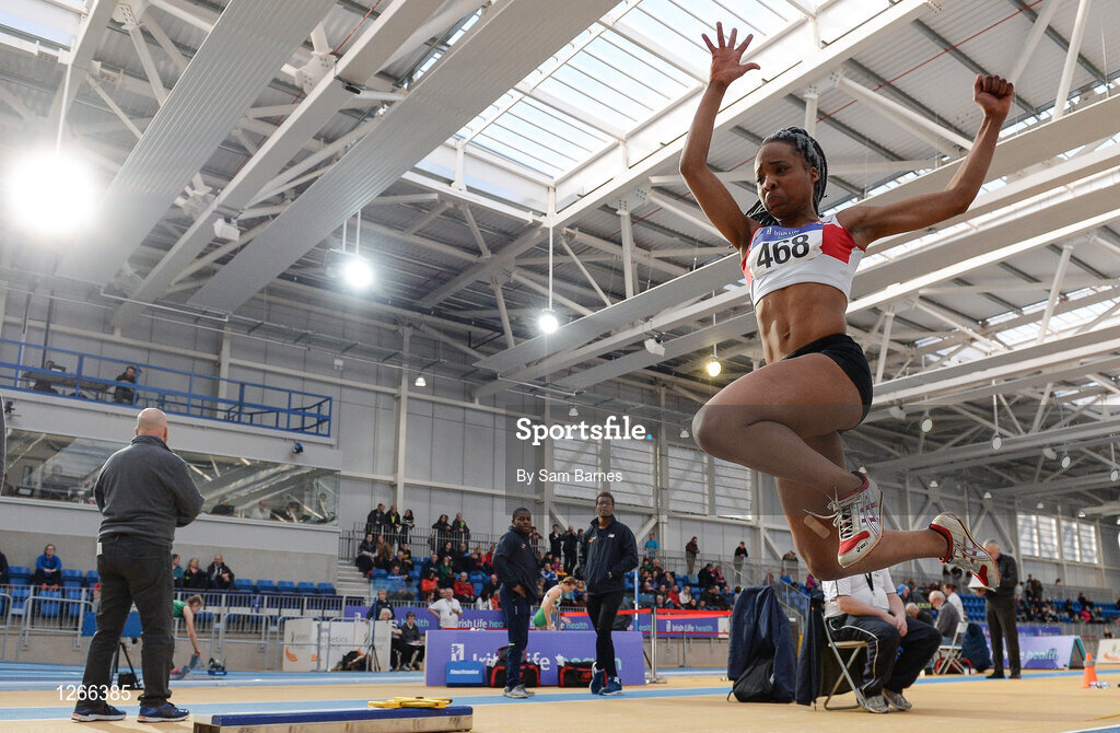 5 February 2017; Solange Diogo of Galway City Harriers competing in the senior women's triple jump during the Irish Life Health AAI Indoor Games at Sport Ireland National Indoor Arena in Abbotstown, Dublin. Photo by Sam Barnes/Sportsfile
