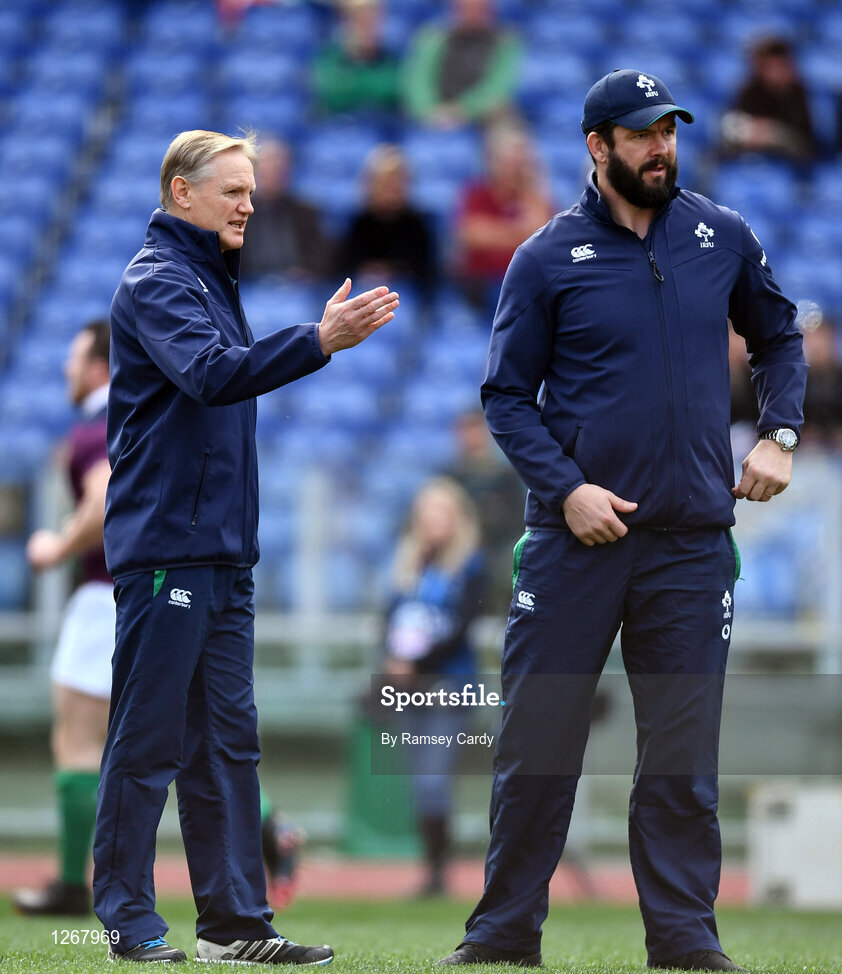 11 February 2017; Ireland head coach Joe Schmidt, left, in conversation with defence coach Andy Farrell ahead of the RBS Six Nations Rugby Championship match between Italy and Ireland at the Stadio Olimpico in Rome, Italy. Photo by Ramsey Cardy/Sportsfile