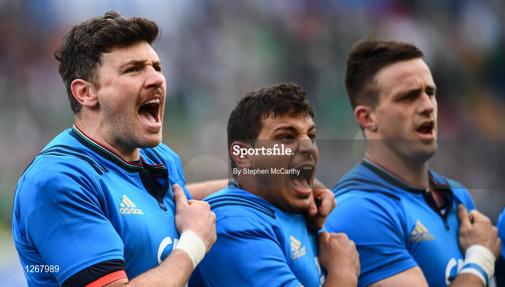 11 February 2017; George Biagi and his Italy team-mates during the National Anthem before the RBS Six Nations Rugby Championship match between Italy and Ireland at the Stadio Olimpico in Rome, Italy. Photo by Stephen McCarthy/Sportsfile