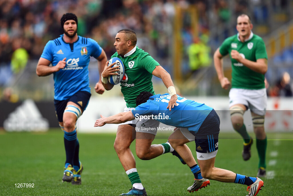 11 February 2017; Simon Zebo of Ireland is tackled by Carlo Canna of Italy during the RBS Six Nations Rugby Championship match between Italy and Ireland at the Stadio Olimpico in Rome, Italy. Photo by Stephen McCarthy/Sportsfile