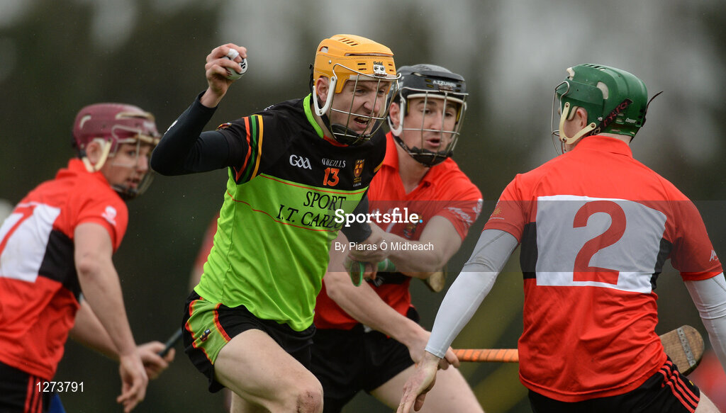 24 February 2017; Jack Fagan of IT Carlow in action against University College Cork's, from left, Rickard Cahalane, Conor Gleeson and Ian Kenny during the Independent.ie HE GAA Fitzgibbon Cup semi-final meeting of IT Carlow and University College Cork at Dangan, in Galway. Photo by Piaras Ó Mídheach/Sportsfile