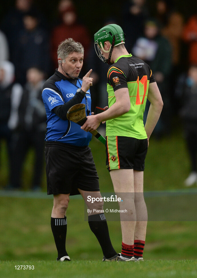 24 February 2017; Mark Russell of IT Carlow is cautioned by referee Barry Kelly during the Independent.ie HE GAA Fitzgibbon Cup semi-final meeting of IT Carlow and University College Cork at Dangan, in Galway. Photo by Piaras Ó Mídheach/Sportsfile
