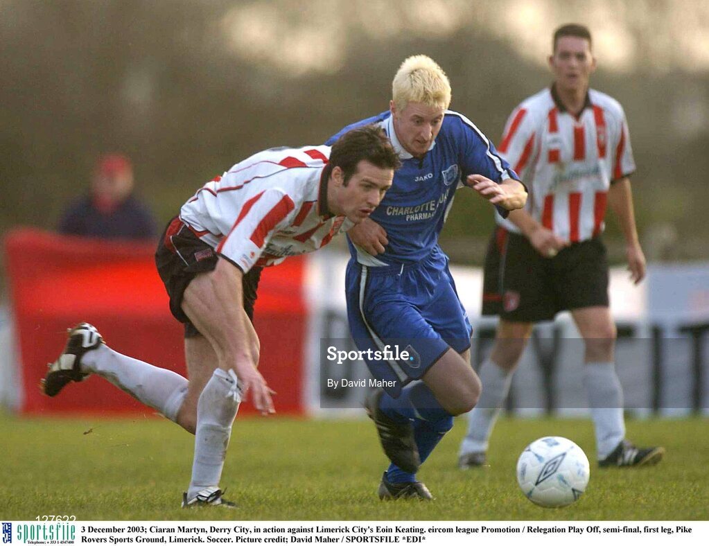 3 December 2003; Ciaran Martyn, Derry City, in action against Limerick City's Eoin Keating. Limerick City v Derry City, eircom league Promotion / Relegation Play Off, semi-final, first leg, Pike Rovers Sports Ground, Limerick. Soccer. Picture credit; David Maher / SPORTSFILE *EDI*