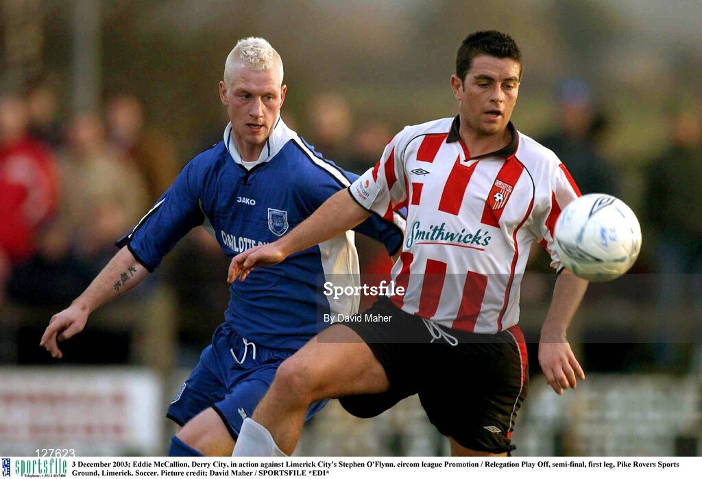 3 December 2003; Eddie McCallion, Derry City, in action against Limerick City's Stephen O'Flynn. Limerick City v Derry City, eircom league Promotion / Relegation Play Off, semi-final, first leg, Pike Rovers Sports Ground, Limerick. Soccer. Picture credit; David Maher / SPORTSFILE *EDI*