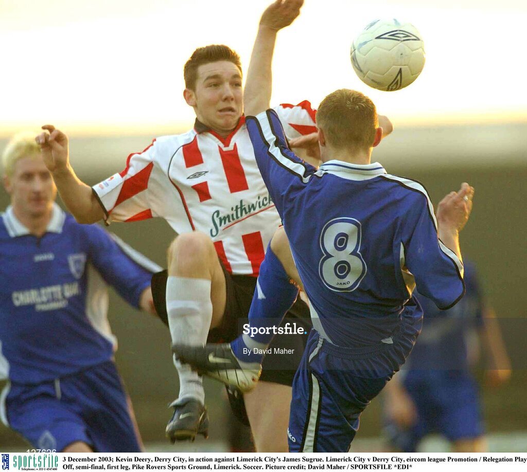 3 December 2003; Kevin Deery, Derry City, in action against Limerick City's James Sugrue. Limerick City v Derry City, eircom league Promotion / Relegation Play Off, semi-final, first leg, Pike Rovers Sports Ground, Limerick. Soccer. Picture credit; David Maher / SPORTSFILE *EDI*