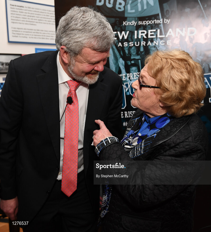 1 March 2017; In attendance at the launch of ‘New Ireland presents Heffo’s Army’, a new exhibition in the Little Museum of Dublin is Kerry GAA legend Eóin ‘The Bomber’ Liston with Mary Heffernan, wife of the late Kevin Heffernan. The former players discussed their memories of the ‘Heffo’ era at the special launch event in front of attendees including GAA Director General, Páraic Duffy and the Lord Mayor of Dublin Brendan Carr at The Little Museum of Dublin in Dublin. Photo by Stephen McCarthy/Sportsfile