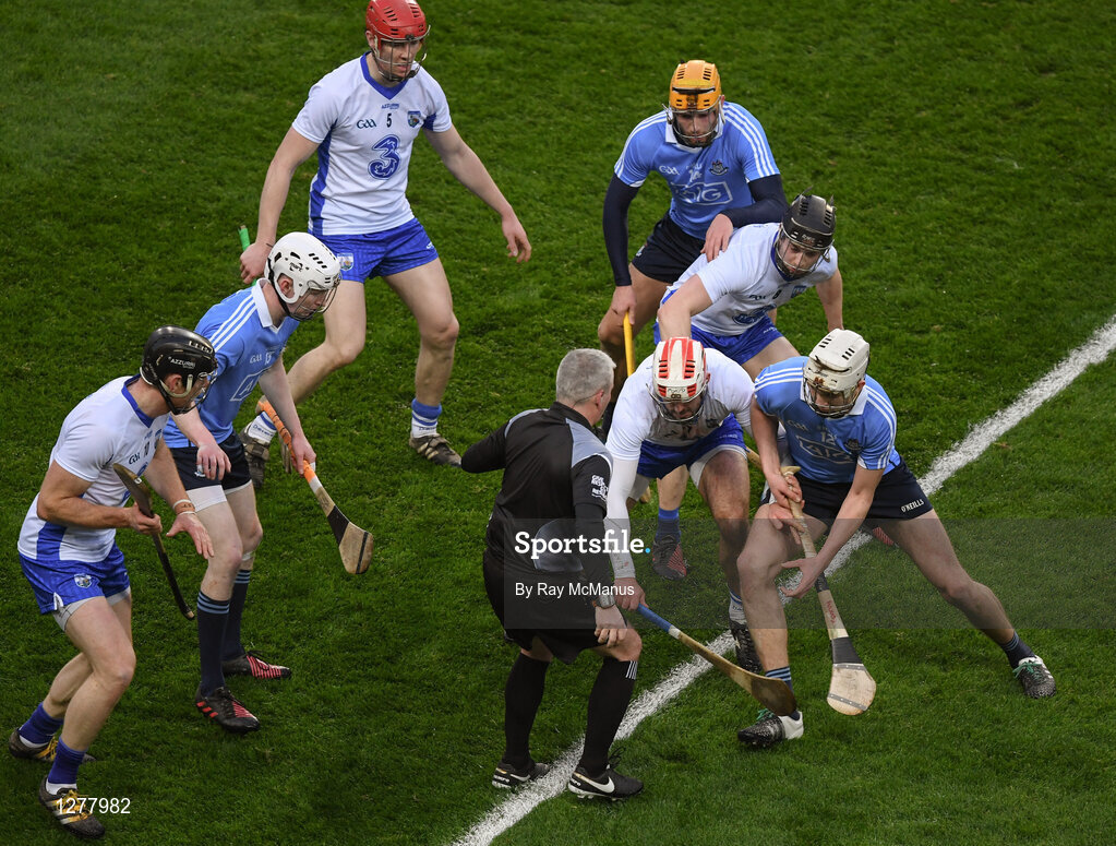 4 March 2017; Referee Johnny Ryan prepares to throw in the sliothar between Eoghan Conroy of Dublin and Stephen Daniels of Waterford during the Allianz Hurling League Division 1A Round 3 match between Dublin and Waterford at Croke Park in Dublin. Photo by Ray McManus/Sportsfile