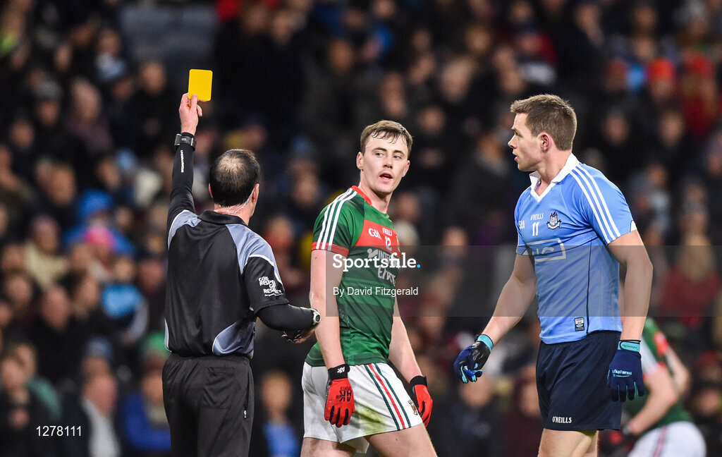 4 March 2017; Diarmuid O'Connor of Mayo is shown a yellow card by referee David Coldrick during the Allianz Football League Division 1 Round 4 match between Dublin and Mayo at Croke Park in Dublin. Photo by David Fitzgerald/Sportsfile