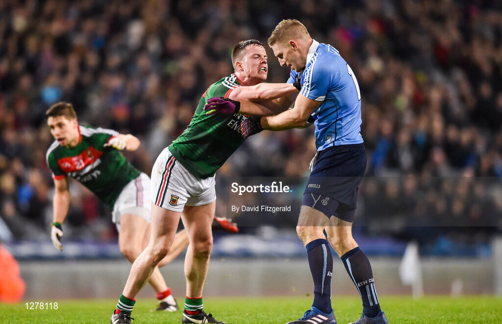 4 March 2017; Stephen Coen of Mayo in action against Eoghan O'Gara of Dublin during the Allianz Football League Division 1 Round 4 match between Dublin and Mayo at Croke Park in Dublin. Photo by David Fitzgerald/Sportsfile