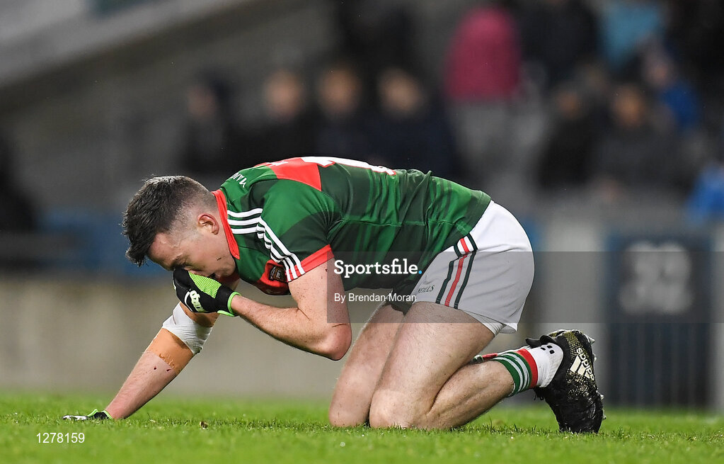 4 March 2017; Evan Regan of Mayo holds his face before going off to be attended to by medical personnel during the Allianz Football League Division 1 Round 4 match between Dublin and Mayo at Croke Park in Dublin. Photo by Brendan Moran/Sportsfile