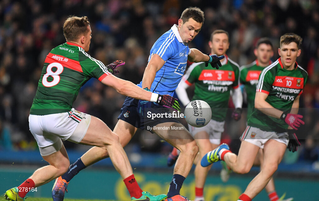 4 March 2017; Dean Rock of Dublin is fouled by Donal Vaughan of Mayo resulting in a penalty for Dublin during the Allianz Football League Division 1 Round 4 match between Dublin and Mayo at Croke Park in Dublin. Photo by Brendan Moran/Sportsfile