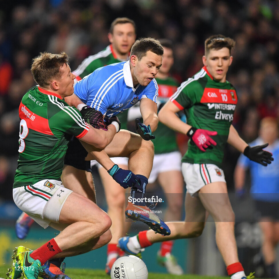 4 March 2017; Dean Rock of Dublin is fouled by Donal Vaughan of Mayo resulting in a penalty for Dublin during the Allianz Football League Division 1 Round 4 match between Dublin and Mayo at Croke Park in Dublin. Photo by Brendan Moran/Sportsfile