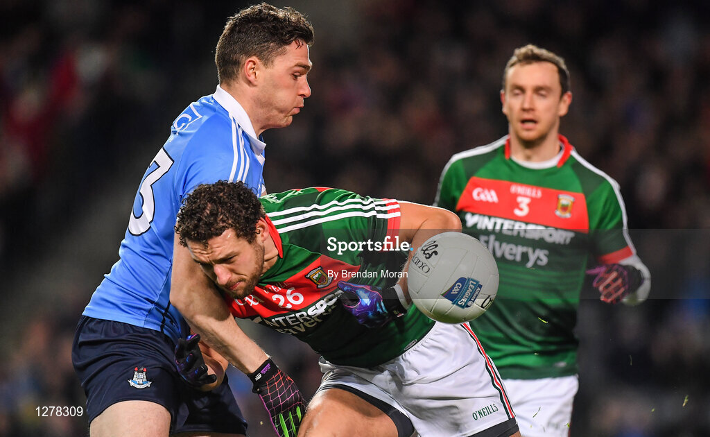 4 March 2017; Tom Parsons of Mayo is tackled by Paddy Andrews of Dublin during the Allianz Football League Division 1 Round 4 match between Dublin and Mayo at Croke Park in Dublin. Photo by Brendan Moran/Sportsfile