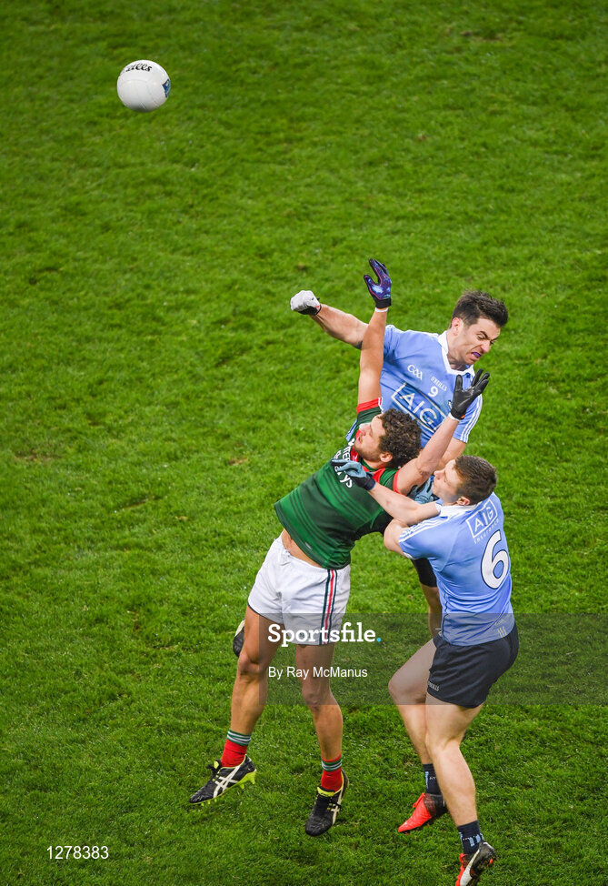 4 March 2017; Tom Parsons of Mayo in action against Michael Darragh Macauley and John Small, 6, of Dublin during the Allianz Football League Division 1 Round 4 match between Dublin and Mayo at Croke Park in Dublin. Photo by Ray McManus/Sportsfile