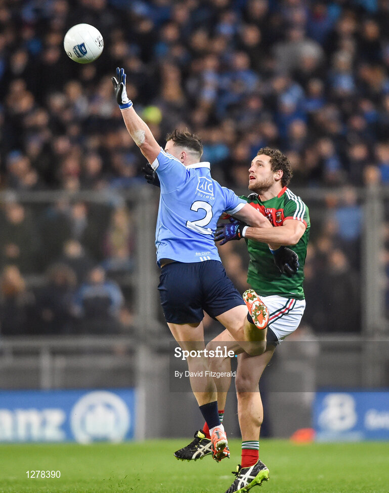 4 March 2017; Philip McMahon of Dublin intercepts a high ball ahead of Tom Parsons of Mayo during the Allianz Football League Division 1 Round 4 match between Dublin and Mayo at Croke Park in Dublin. Photo by David Fitzgerald/Sportsfile