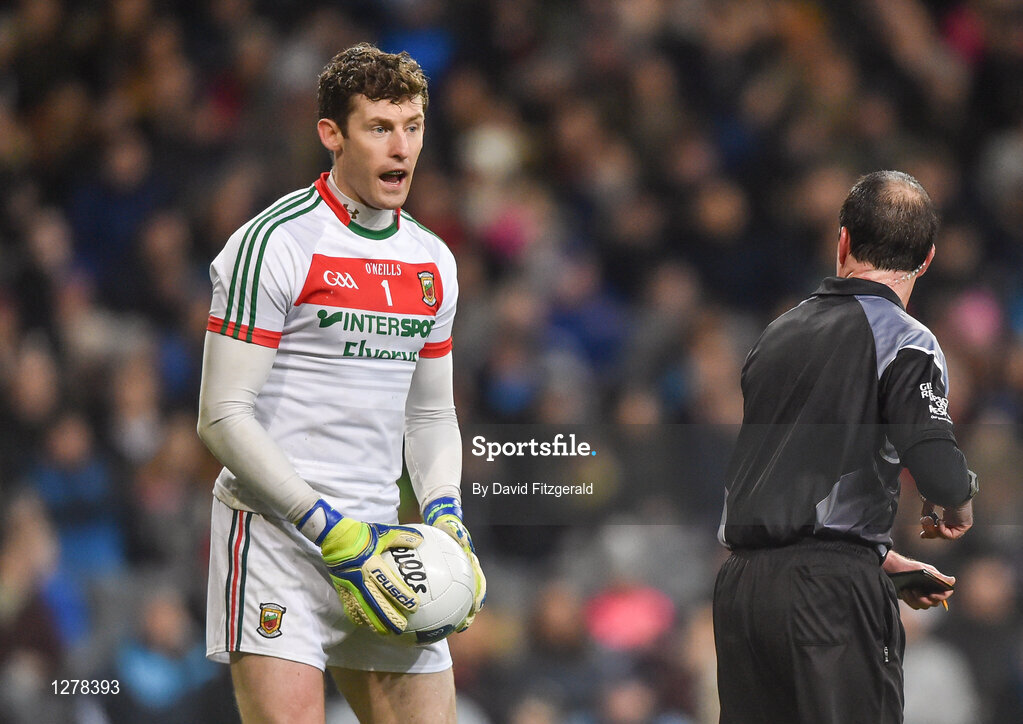 4 March 2017; David Clarke of Mayo speaks to referee David Coldrick during the Allianz Football League Division 1 Round 4 match between Dublin and Mayo at Croke Park in Dublin. Photo by David Fitzgerald/Sportsfile