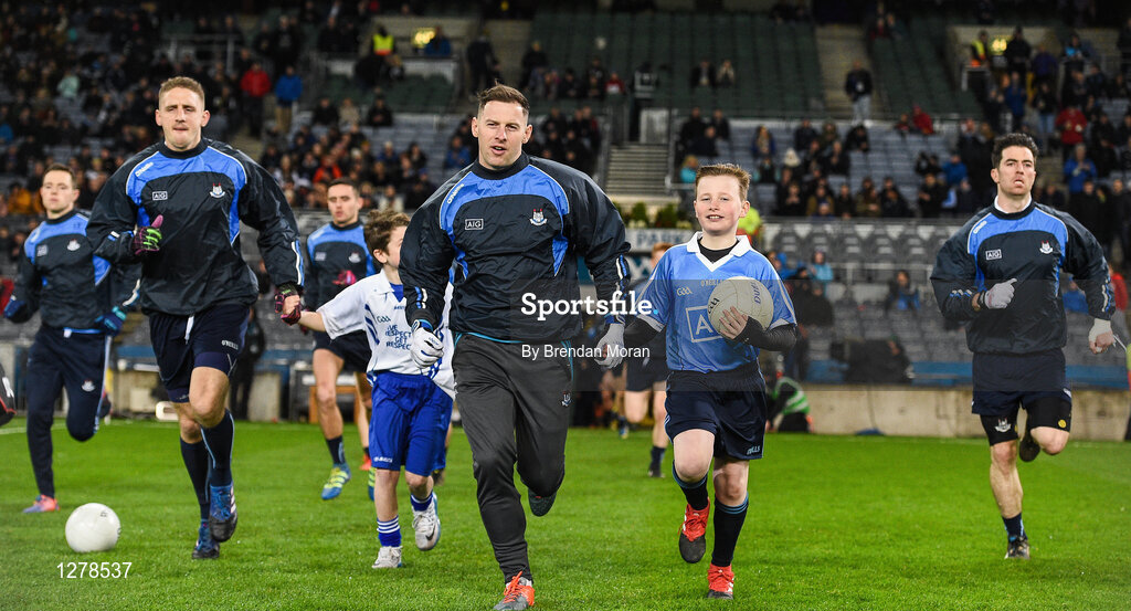 4 March 2017; Allianz mascot Cian Lumley, from St Brigid's NS, Killester, Dublin, runs out with Philip McMahon of Dublin ahead of the Allianz Football League Division 1 Round 4 game between Dublin and Mayo at Croke Park in Dublin. Photo by Brendan Moran/Sportsfile