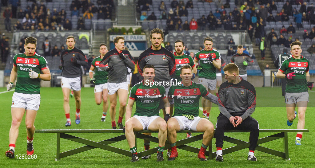4 March 2017; The Mayo run out for the team photo ahead of the Allianz Football League Division 1 Round 4 match between Dublin and Mayo at Croke Park in Dublin. Photo by David Fitzgerald/Sportsfile
