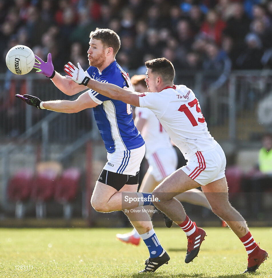 12 March 2017; Rory Dunne of Cavan in action against Darren McCurry of Tyrone during the Allianz Football League Division 1 Round 3 Refixture match between Tyrone and Cavan at Healy Park in Omagh, Co. Tyrone. Photo by Oliver McVeigh/Sportsfile