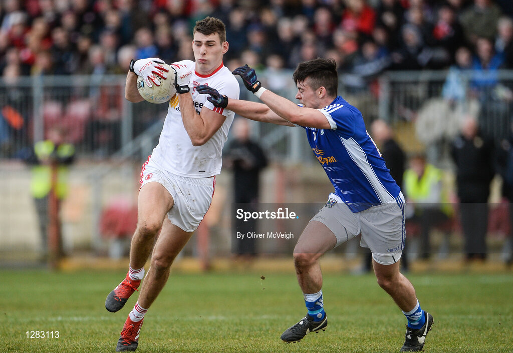 12 March 2017; Padraig McNulty of Tyrone in action against Gerard Smith of Cavan during the Allianz Football League Division 1 Round 3 Refixture match between Tyrone and Cavan at Healy Park in Omagh, Co. Tyrone. Photo by Oliver McVeigh/Sportsfile