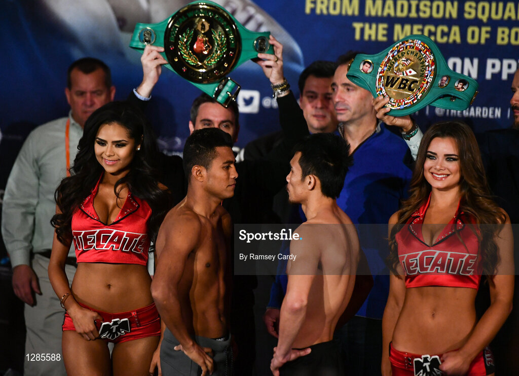 17 March 2017; Roman Gonzalez, left, faces off with Wisaksil Wangek ahead of their super flyweight title bout at The Theater in Madison Square Garden, New York, USA. Photo by Ramsey Cardy/Sportsfile