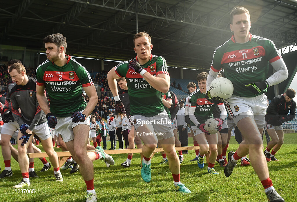 19 March 2017; Brendan Harrison, left, Donal Vaughan and Cillian O'Connor of Mayo before the start of the Allianz Football League Division 1 Round 5 match between Mayo and Cavan at Elverys MacHale Park in Castlebar, Co Mayo. Photo by David Maher/Sportsfile