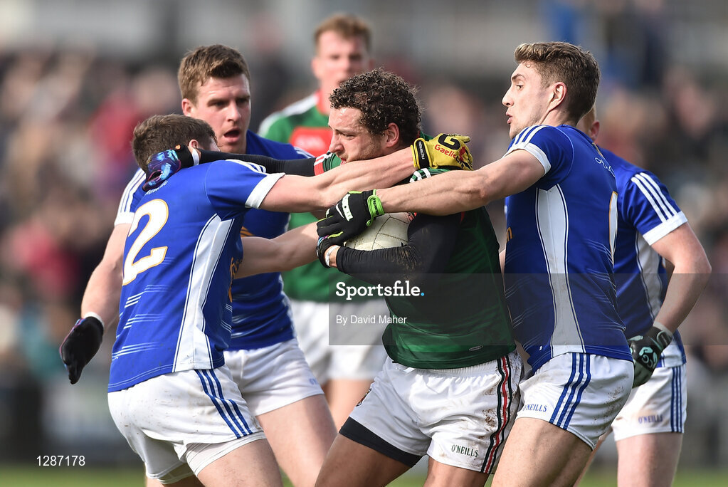 19 March 2017; Tom Parsons of Mayo in action against Niall Clerkin, left, and Killian Clarke of Cavan during the Allianz Football League Division 1 Round 5 match between Mayo and Cavan at Elverys MacHale Park in Castlebar, Co Mayo. Photo by David Maher/Sportsfile