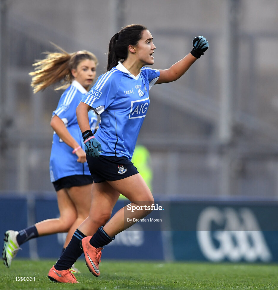 25 March 2017; Hannah O'Neill of Dublin celebrates kicking the equalising score late in the Lidl Ladies Football National League Round 6 match between Dublin and Mayo at Croke Park, in Dublin. Photo by Brendan Moran/Sportsfile