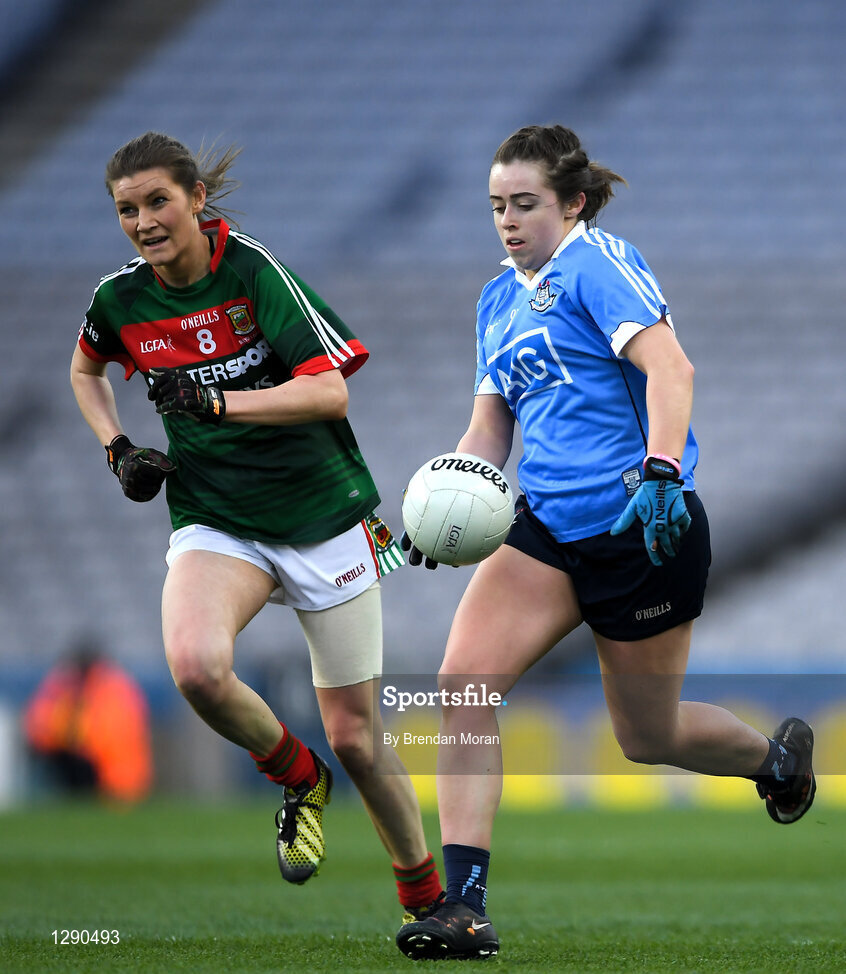 25 March 2017; Kate Fitzgibbon of Dublin in action against Grace Kelly of Mayo during the Lidl Ladies Football National League Round 6 match between Dublin and Mayo at Croke Park, in Dublin. Photo by Brendan Moran/Sportsfile