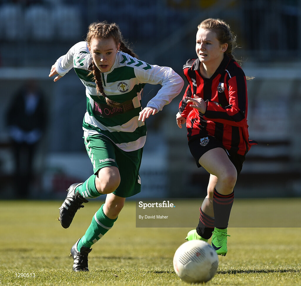 26 March 2017; Charlie Murray of Kilmore Celtic in action against Saoirse Healy of Cregmore Claregalway FC during the FAI Women's U14 Cup Final match between Cregmore Claregalway and Kilmore Celtic at Eamon Deacy Park in Galway. Photo by David Maher/Sportsfile