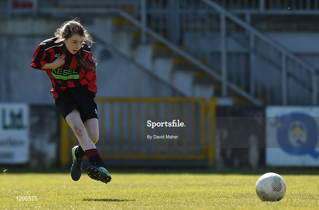 26 March 2017; Aoibheann Costello of Cregmore Claregalway FC shoots to score her side's third goal during the FAI Women's U14 Cup Final match between Cregmore Claregalway and Kilmore Celtic at Eamon Deacy Park in Galway. Photo by David Maher/Sportsfile