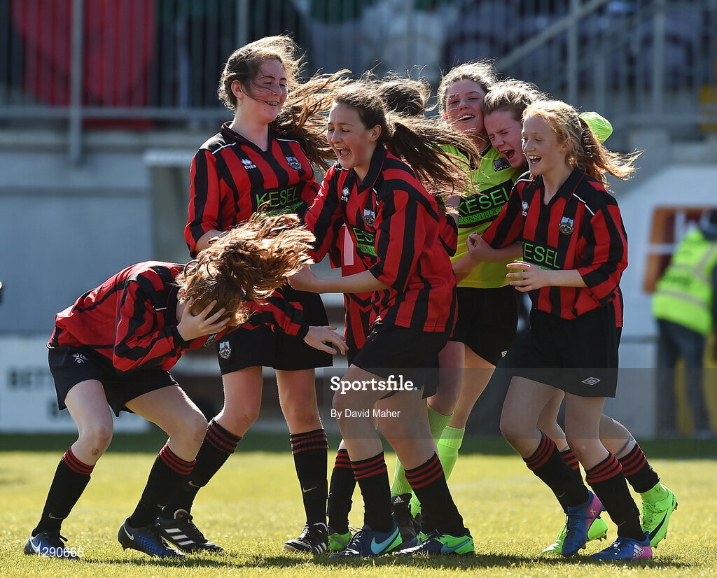 26 March 2017; Players of Cregmore Claregalway celebrate at the end of the FAI Women's U14 Cup Final match between Cregmore Claregalway and Kilmore Celtic at Eamon Deacy Park in Galway. Photo by David Maher/Sportsfile