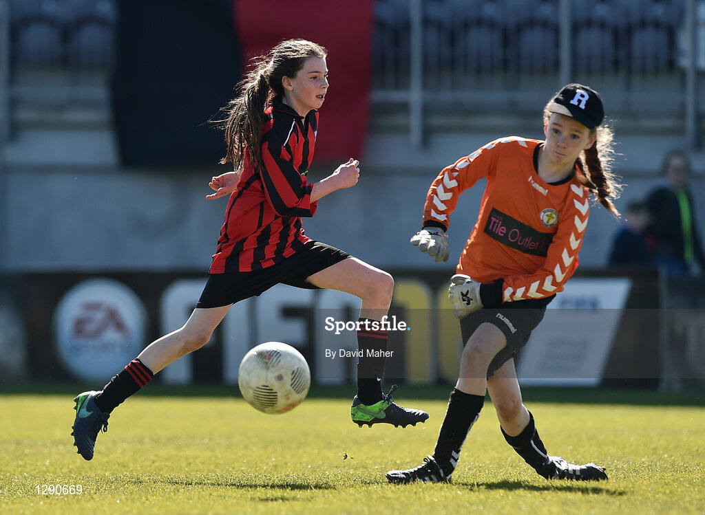 26 March 2017; Aoibheann Costello of Cregmore Claregalway FC in action against Robyn Murray, goalkeeper of Kilmore Celtic during the FAI Women's U14 Cup Final match between Cregmore Claregalway and Kilmore Celtic at Eamon Deacy Park in Galway. Photo by David Maher/Sportsfile