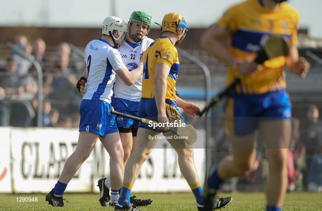 26 March 2017; Tom Devine of Waterford, right, is congratulated by team-mate Shane Bennett after scoring their side's second goal during the Allianz Hurling League Division 1A Round 5 match between Clare and Waterford at Cusack Park in Ennis. Photo by Diarmuid Greene/Sportsfile