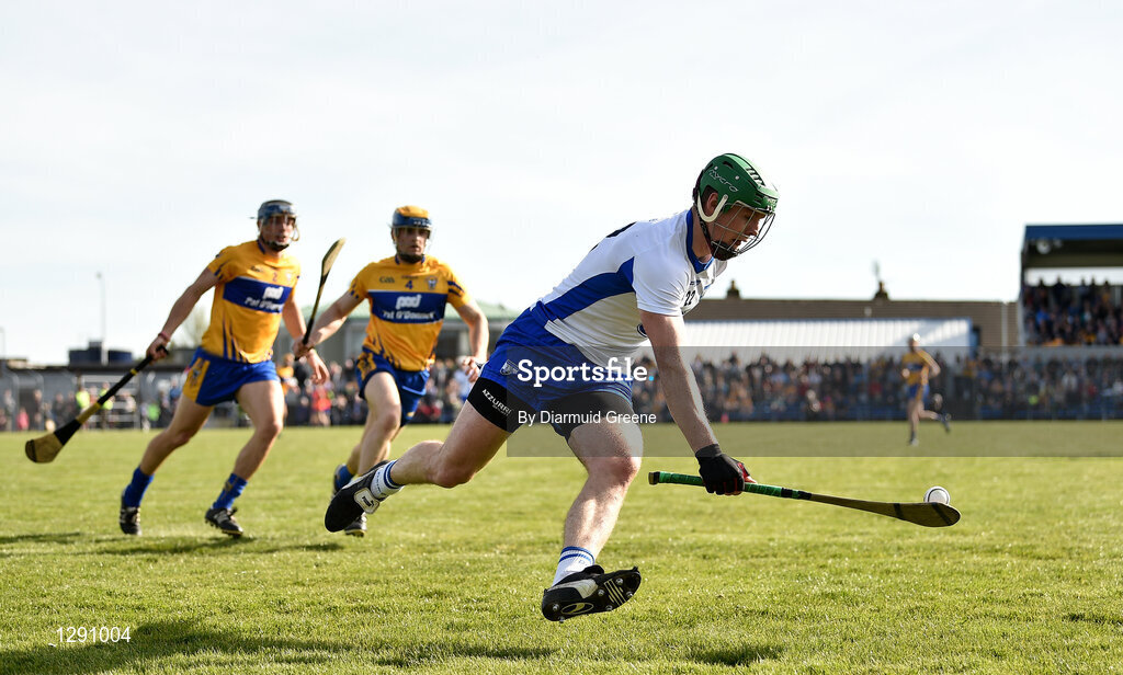 26 March 2017; Tom Devine of Waterford in action against David McInerney, left, and Seadna Morey of Clare during the Allianz Hurling League Division 1A Round 5 match between Clare and Waterford at Cusack Park in Ennis. Photo by Diarmuid Greene/Sportsfile