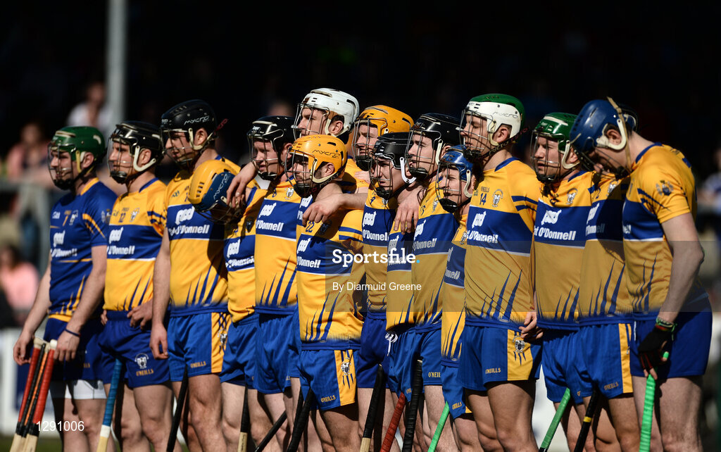 26 March 2017; The Clare team stand together during the playing of the national anthem before the Allianz Hurling League Division 1A Round 5 match between Clare and Waterford at Cusack Park in Ennis. Photo by Diarmuid Greene/Sportsfile