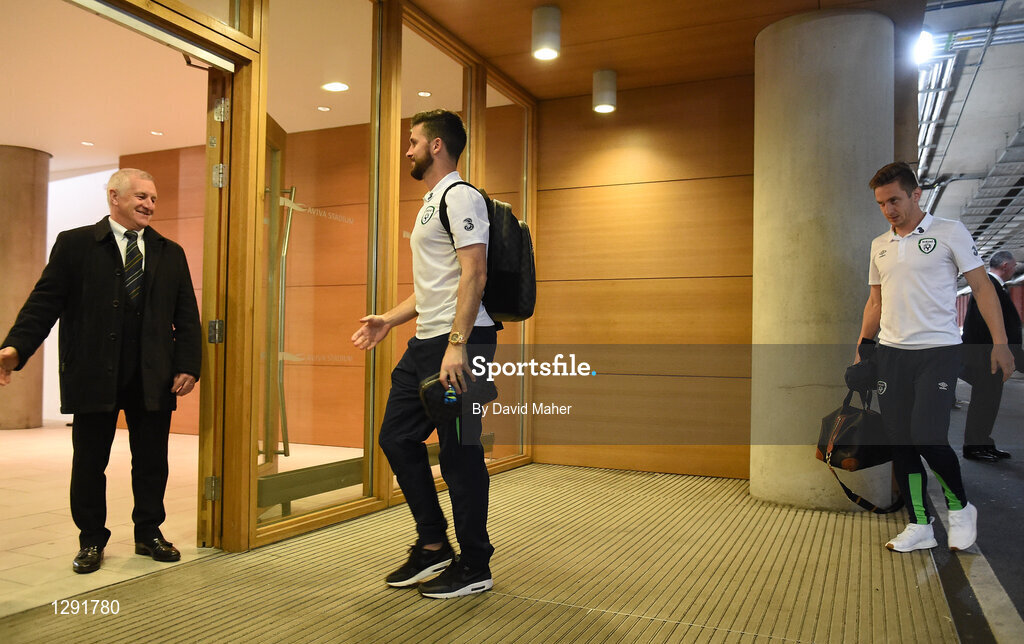 28 March 2017; Shane Long and Kevin Doyle of Republic of Ireland arriving off the team bus prior to the International Friendly match between the Republic of Ireland and Iceland at the Aviva Stadium in Dublin. Photo by David Maher/Sportsfile