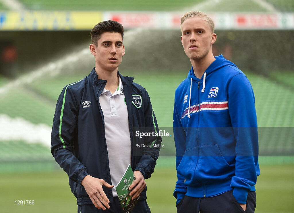 28 March 2017; Callum O'Dowda of Republic of Ireland with Hordur Magnússon of Iceland prior to the International Friendly match between the Republic of Ireland and Iceland at the Aviva Stadium in Dublin. Photo by David Maher/Sportsfile