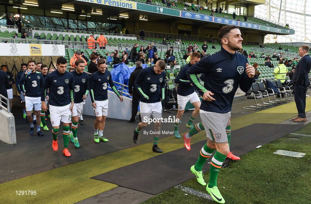 28 March 2017; Robbie Brady of Republic of Ireland leads his team-mates out for the warm-up prior to the International Friendly match between the Republic of Ireland and Iceland at the Aviva Stadium in Dublin. Photo by David Maher/Sportsfile